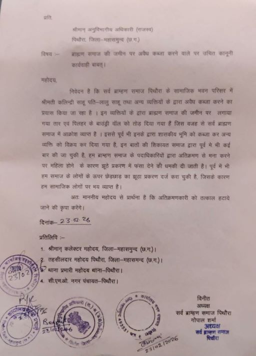 पिथौरा(जीतयादव)। ब्राह्मण समाज द्वारा संचालित सामाजिक भवन परिसर की जमीन पर कथित अवैध कब्जे को लेकर विवाद गहराता जा रहा है। मामले में समाज के पदाधिकारियों ने एसडीएम पिथौरा को ज्ञापन सौंपकर अतिक्रमण हटाने और उचित कानूनी कार्रवाई की मांग की है।