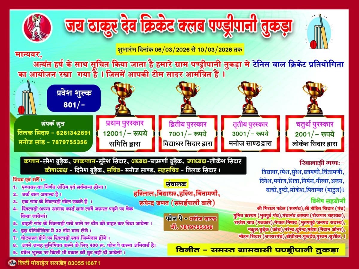 इसी बीच 8 मार्च को अंतर्राष्ट्रीय महिला दिवस के अवसर पर जय ठाकुरदेव क्रिकेट क्लब के तत्वावधान में विशेष कार्यक्रम आयोजित किया गया। कार्यक्रम में गांव की महिलाओं को सम्मानित करते हुए उन्हें साल, श्रीफल और गुलदस्ता भेंट किया गया। आयोजकों ने कहा कि महिलाओं के सम्मान और समाज में उनकी भागीदारी को बढ़ावा देने के उद्देश्य से यह कार्यक्रम रखा गया।