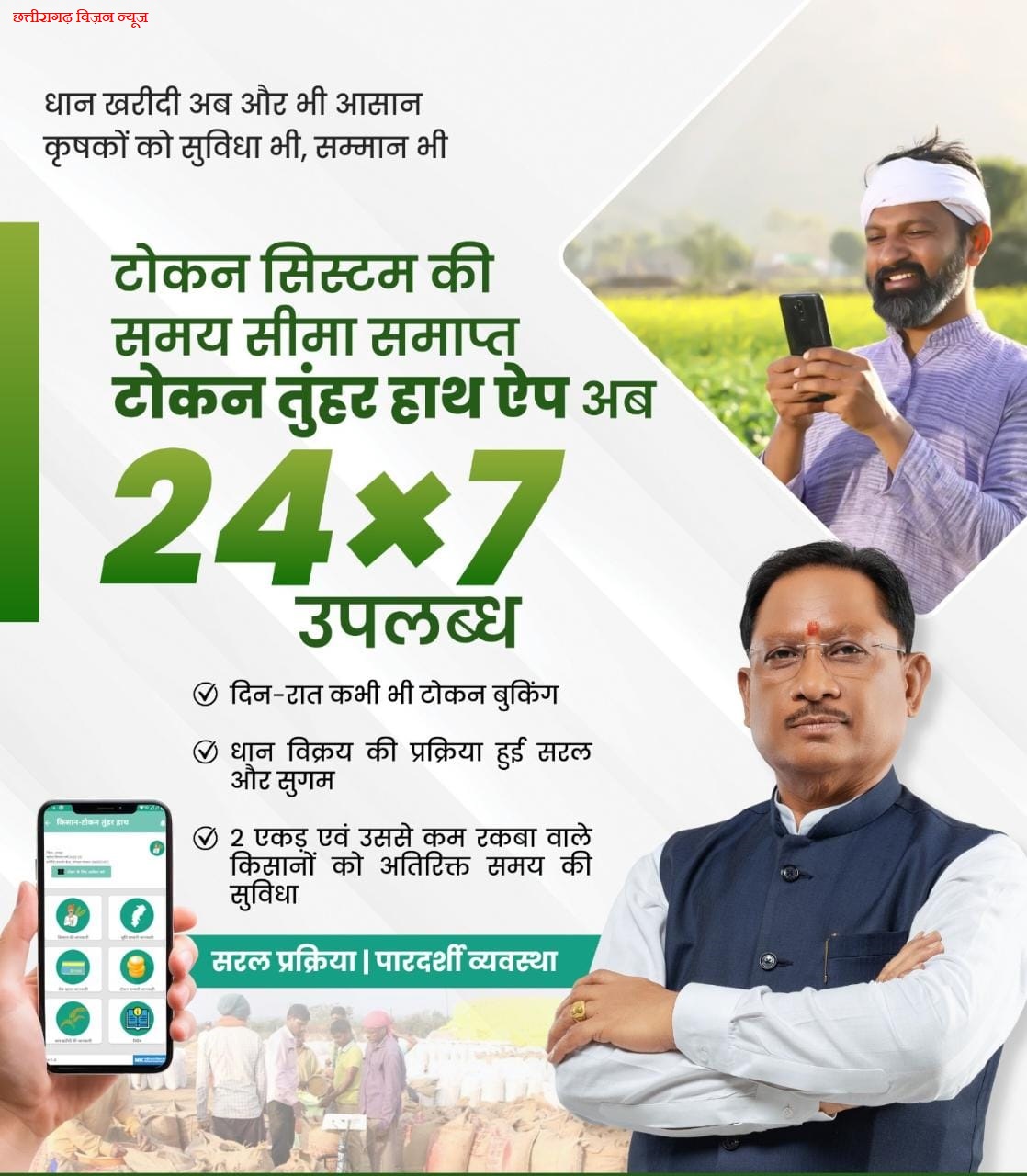 बसना(रूपानंद साव)विशेष संवाददाता। किसानों की सुविधा को ध्यान में रखते हुए “टोकन तुंहर हाथ” ऐप को अब 24 घंटे, सातों दिन (24×7) उपलब्ध करा दिया गया है। धान खरीदी प्रक्रिया को किसानों के लिए और अधिक सरल, सुगम व पारदर्शी बनाने की दिशा में छत्तीसगढ़ राज्य सरकार ने एक अहम फैसला लिया है। अब किसानों को टोकन बुक करने के लिए किसी निश्चित समय का इंतजार नहीं करना पड़ेगा। वे दिन हो या रात, अपनी सुविधा के अनुसार कभी भी टोकन प्राप्त कर सकेंगे।